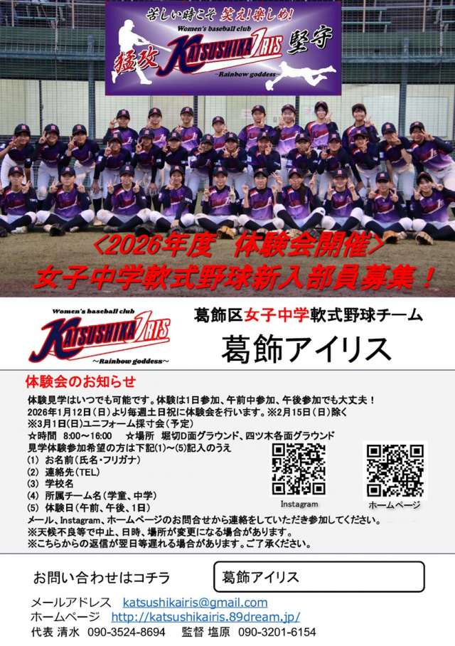 葛飾アイリスは東京都葛飾区を拠点に活動開始する中学女子軟式野球クラブチームです。